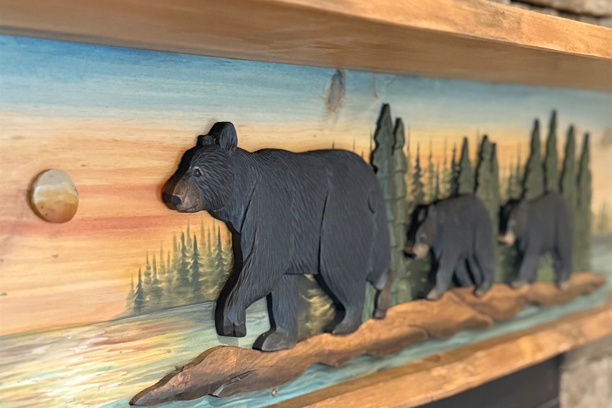 The time in between sunset and sunrise was filled with delight. Carefully chosen lighting fixtures gave me choices of darkness or golden shimmers on the logs reaching high above my head. Character beams stretch across this open style cabin where everything is remembered. The thoughtfulness of a carved bear mantle suspended above the gas fireplace, stones contrasting with honey-colored wood, trimmed all around with a rich bear tone, make every direction a pleasure for the eye to behold.