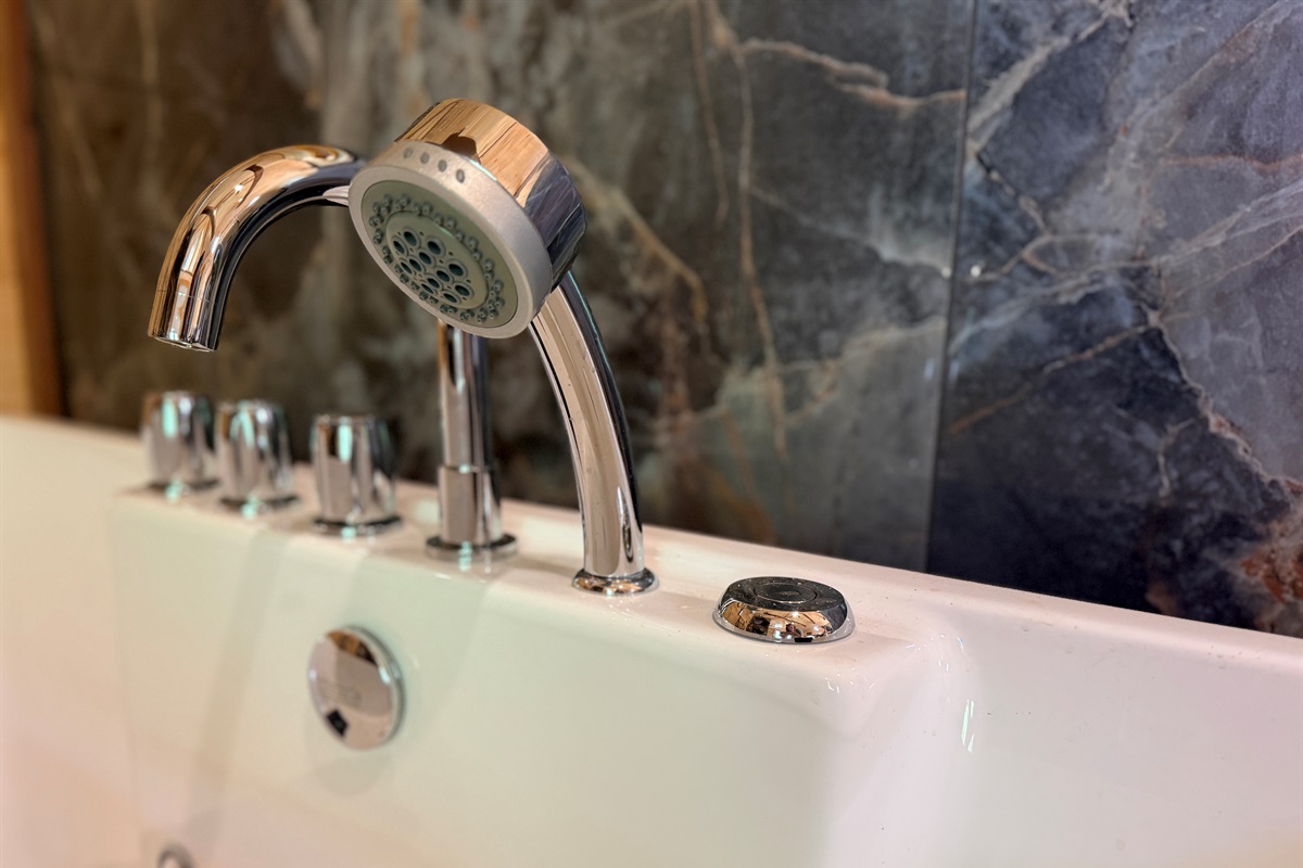 A slight rise sets off the jacuzzi tub with head pillows at both ends. A barn door slides across the marble shower and bathroom area. Fixtures and accents are all in gold.