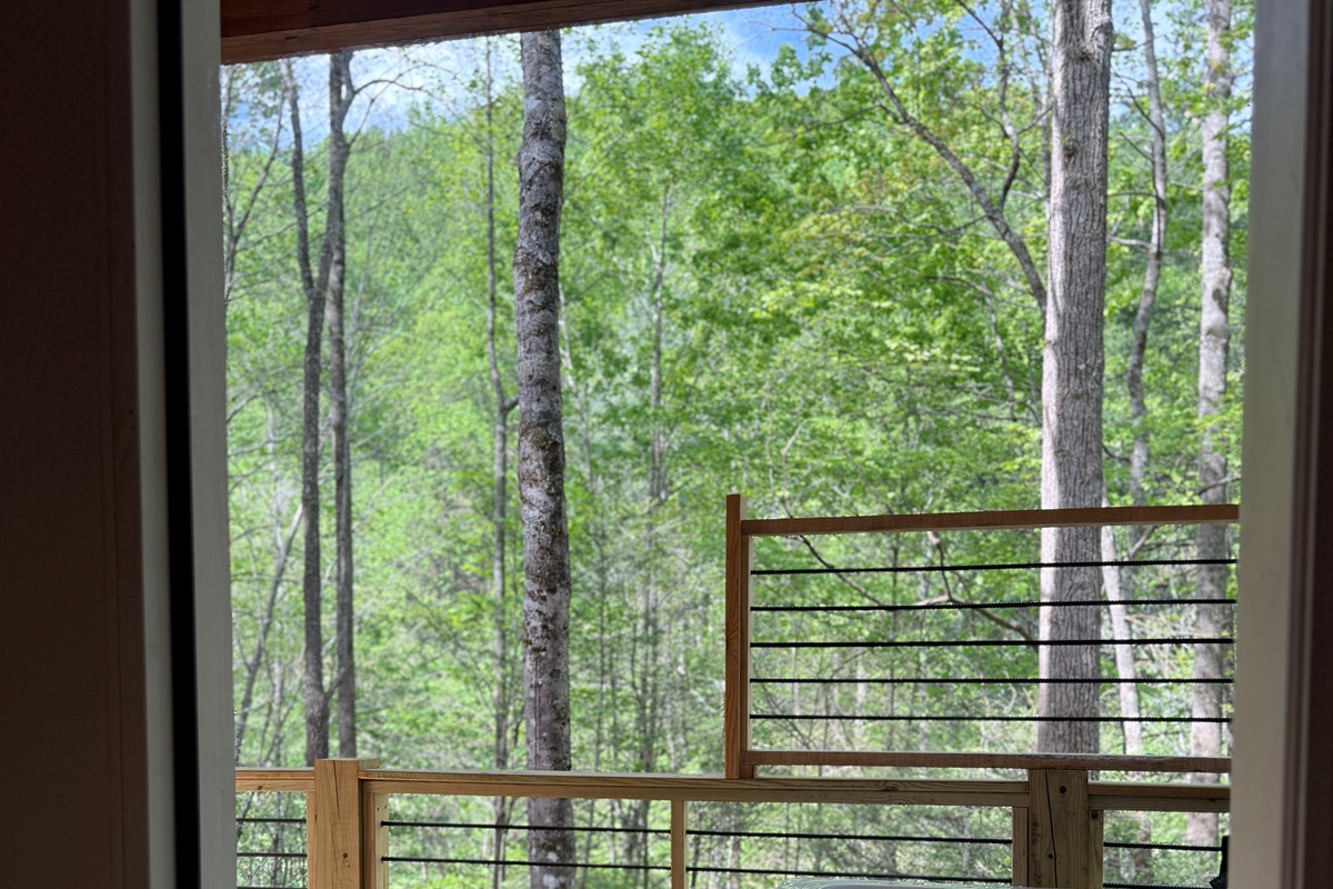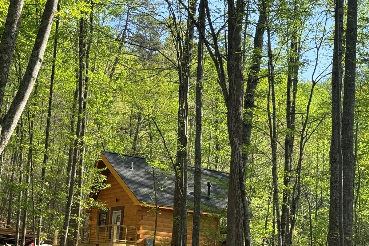 *“What a treat! I spent last night in a brand new cabin nestled on a mountainside. Trees are all around so my sunset was through the spring green forested slope to the west (viewed from the hot tub) and my sunrise poured light through the kitchen windows onto my Keurig coffee, sunlight splashing across the butcher block bar.